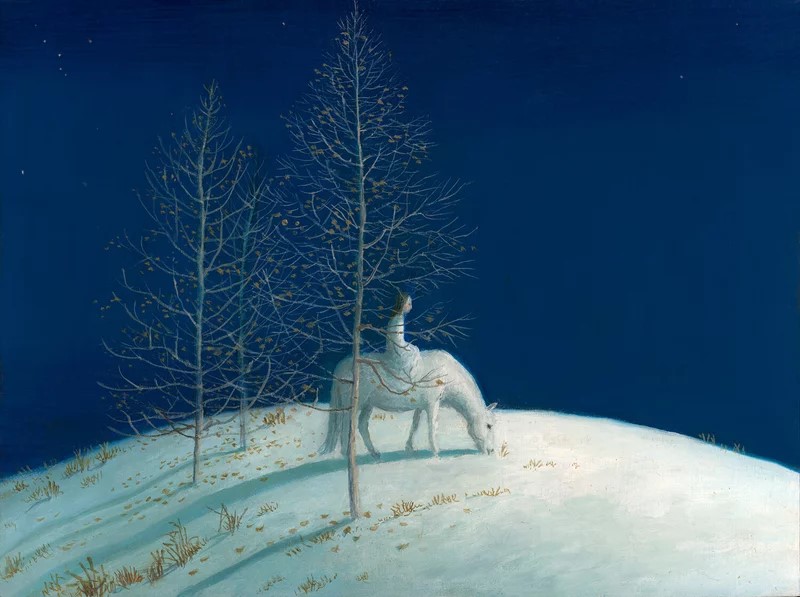 수수께끼 같은 장면과 주인공으로 가득한 그림, 드로잉, 판화를 만드는 아론 비젠펠트는 자신이 말했듯이 "구체적인 내용은 보는 사람에게 맡기는 것"을 선호합니다. 그의 작품은 만화책 일러스트레이터로서의 초기 작업을 반영하며 낭만주의 와 신비로움이 스며 있습니다. 남성과 소년이 가끔 카메오로 등장하지만, 그의 작품은 대개 시골과 자연 경관이나 황량한 도시 거리에 고립된 젊은 여성과 소녀를 중심으로 합니다. 어린 시절의 도시인 산타크루즈는 여전히 그의 생각을 지배하고 있으며, 겨울 장면을 포함한 대부분의 장면의 배경으로 사용됩니다. 비젠펠트는 자신의 작품 각각을 보는 사람에게 "나머지 이야기를 채워넣으라는" "초대장"으로 봅니다. Sect (2013)에서 소녀가 손에 거미줄을 쥐고 있고, 보는 사람이 어떻게 사용해야 할지 상상하는 대로 사용할 수 있습니다.