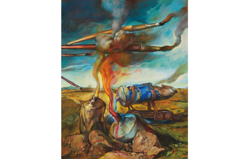 Samuel Bak은 홀로코스트 생존자로서의 경험을 바탕으로 개인적인 기억, 역사적 사실, 상징주의를 함께 엮어 초현실적인 그림을 만듭니다. 그는 예루살렘의 베잘렐 국립 박물관과 텔아비브 미술관 에서 개인전을 열었으며 , 그의 작품은 전 세계의 홀로코스트 박물관에 전시되었습니다. 제2차 세계 대전 직전 폴란드 빌니우스의 유대인 가정에서 태어난 Bak은 1940~44년까지 소련과 독일의 점령 하에 살았습니다. 그와 그의 어머니는 지역 수녀원에서 보호를 받았지만, 그의 아버지와 네 명의 조부모는 나치에게 살해당했습니다. Bak은 1948년 새로 건국된 이스라엘로 이주한 후 뮌헨에서 미술을 공부했고 나중에는 예루살렘의 베잘렐 미술 학교에서 공부했습니다. 그의 작품에는 전쟁 의 여파가 두드러지게 나타나며, 20세기에 유대인 학살 과 그에 따른 유대인들의 해방을 나타내는 시각적 은유도 마찬가지입니다 .